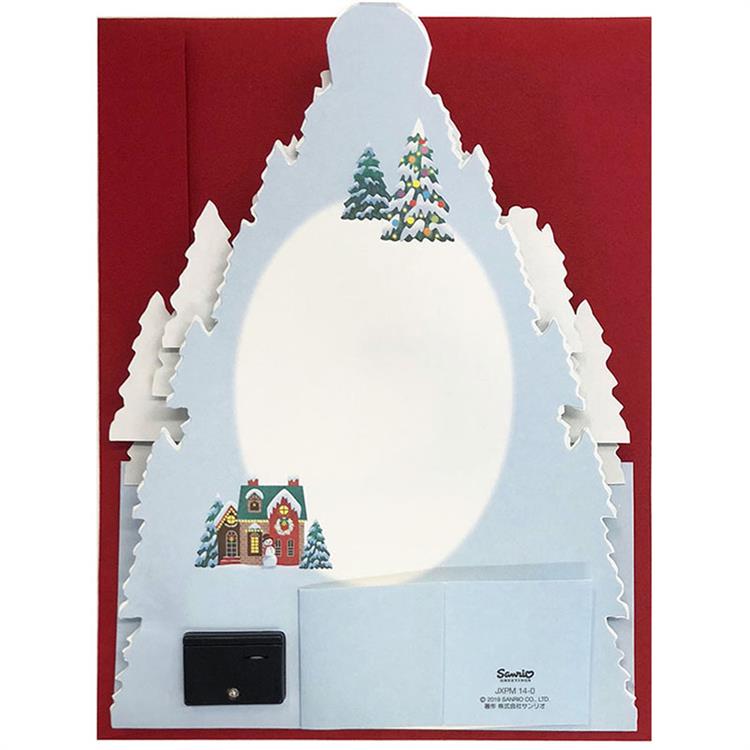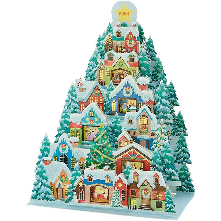 カードの下部を手前に開くと斜面に建つ家や木が立体になり、ツリー形の風景として立てて飾れます。ツリートップのボタンを押すと、曲に合わせて光がともり、家々の中の温かなクリスマスの様子がお楽しみいただけます。キラキラ光るラメ加工を施しています。カードの裏側にメッセージスペースがあります。
