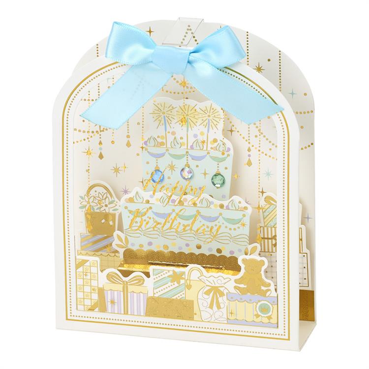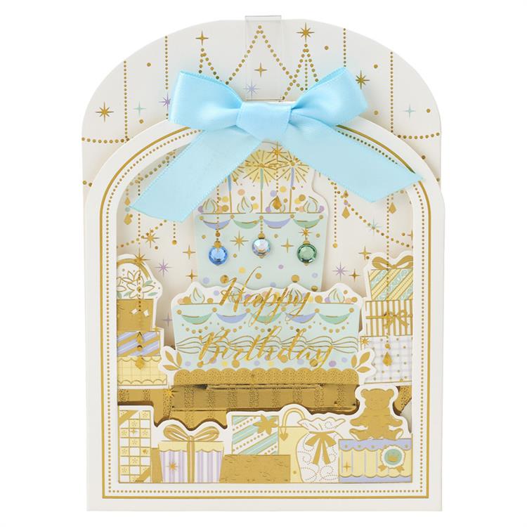 水色のリボンと、金ホログラム箔加工が施された、立てて飾れるアーチ形のバースデーカードです。