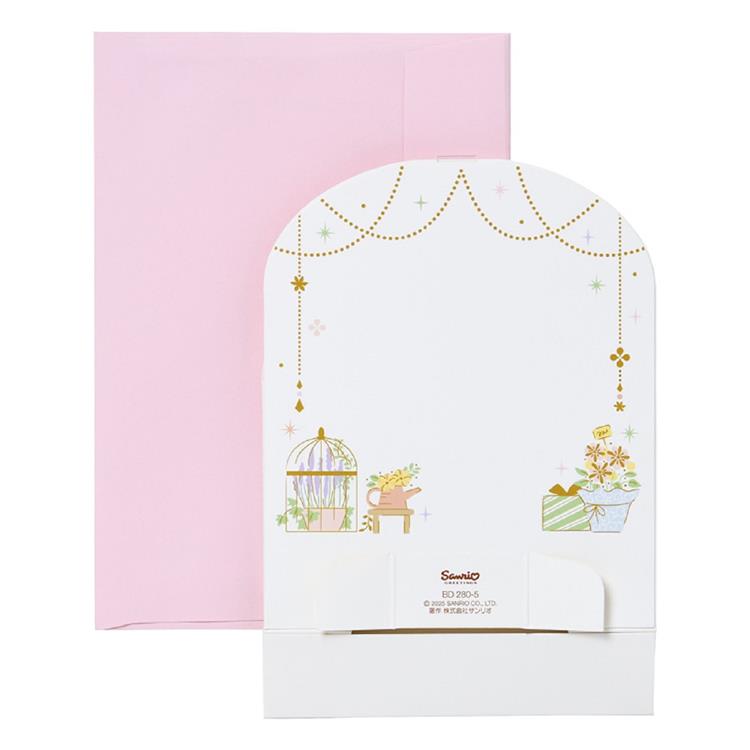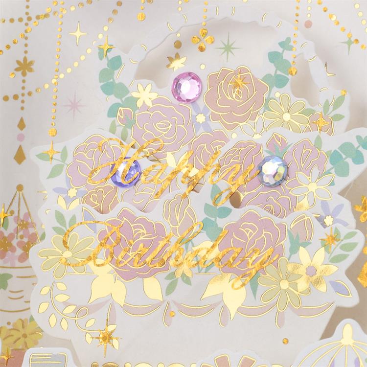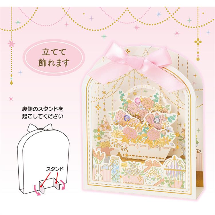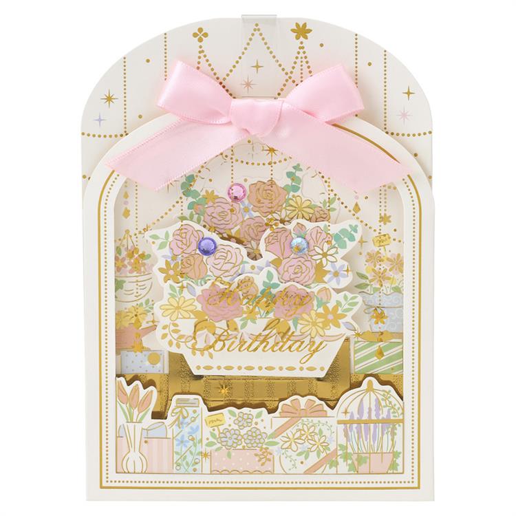ピンク色のリボンと、金ホログラム箔加工がほどこされた、立てて飾れるアーチ形のバースデーカードです。