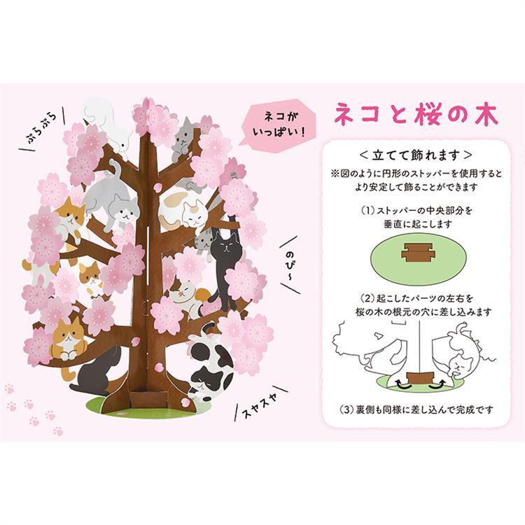 桜の木とネコたちがにぎやかに広がる、春の立体カード