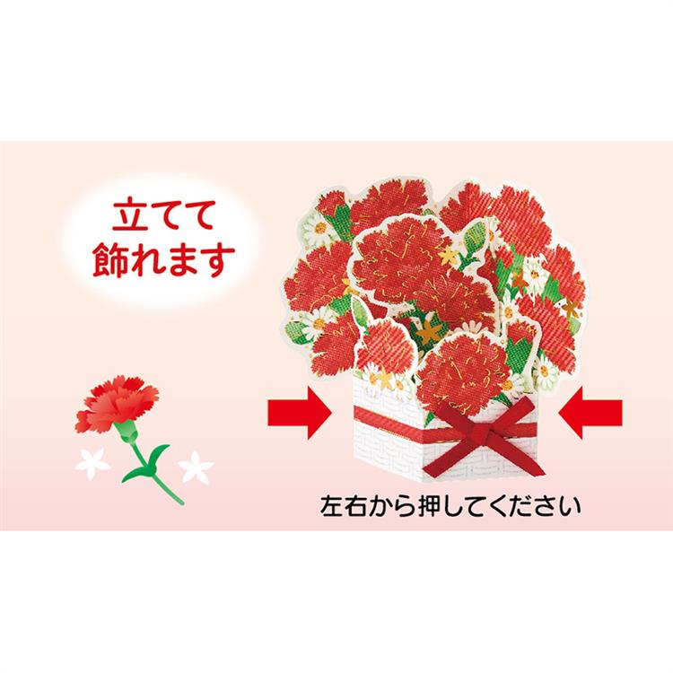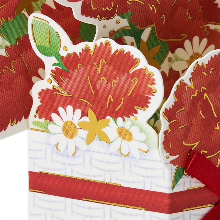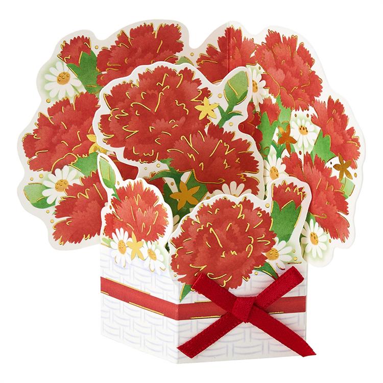 ・赤いカーネーションの小さな花かごの立体カードです。