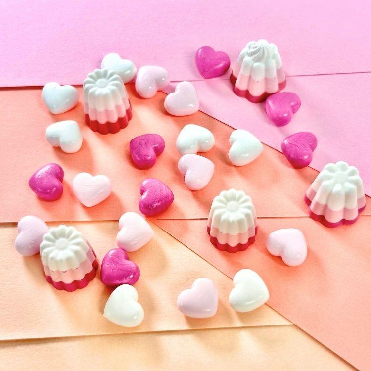 封緘がスイーツのような彩りをまとう、カヌレ型5粒と、ハート型約20粒入り。