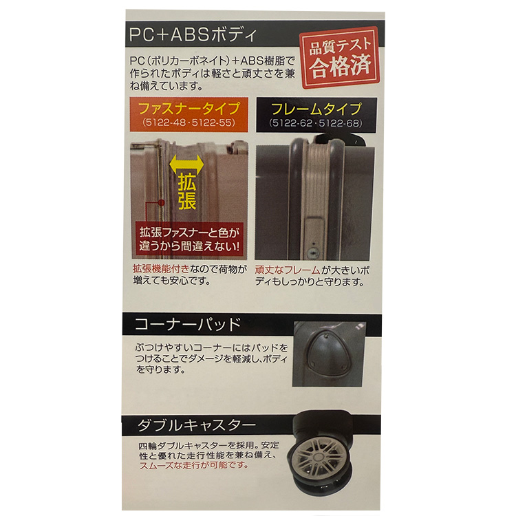 軽さと強さを兼ね備えたポリカーボネートとABS樹脂を使用したキャリーケースです。