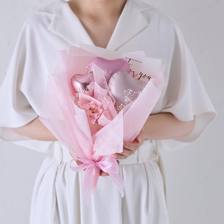ハート型バルーン×3・ブリザーブドフラワー・アートフラワーでアレンジした、燦たる華やかさ際立つ「バルーンブーケ」。