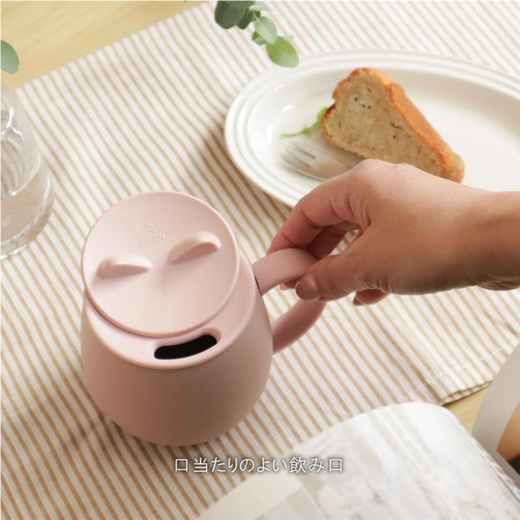 猫の耳を押すと開いて 、 開閉すらも癒し時間になるマグカップは保温保冷効力しっかりの真空二重構造。