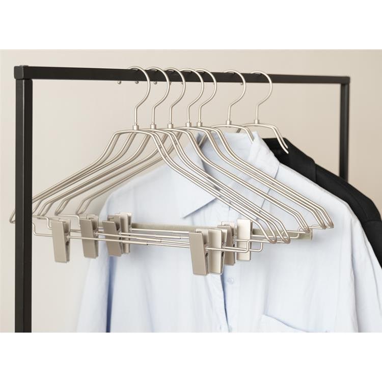 パンツやスカートを掛けてもずり落ちにくく、衣類をしっかりホールド。スーツやセットアップの収納にも最適です。