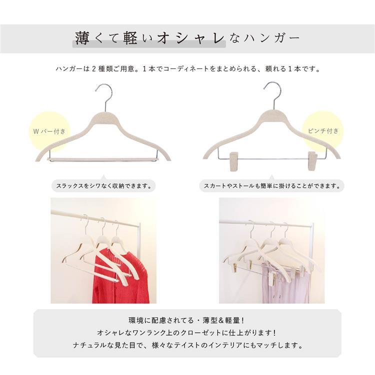 さらに便利なピンチ付きでスカートやストールも簡単に掛けられ、Wバーにはスラックスをシワなく収納できます。