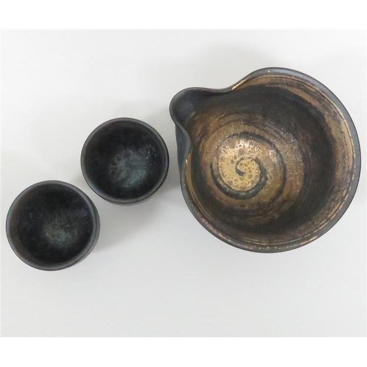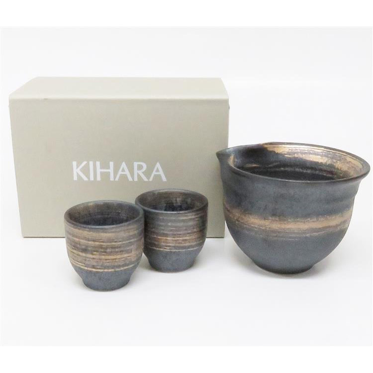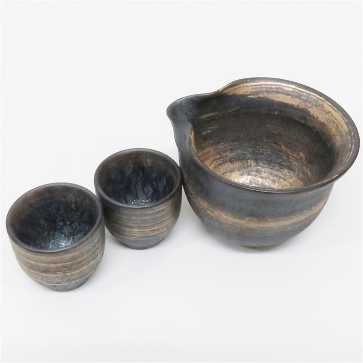 味わい深い独特の黒い釉薬の上に、華やかな金彩の刷毛跡が美しい有田焼の酒器です。素材感のあるザラザラとした質感も楽しめます。片口と、ぐい呑2つの3点セットです。ギフトボックス入り。