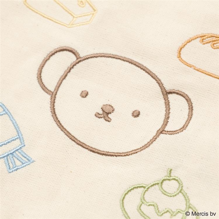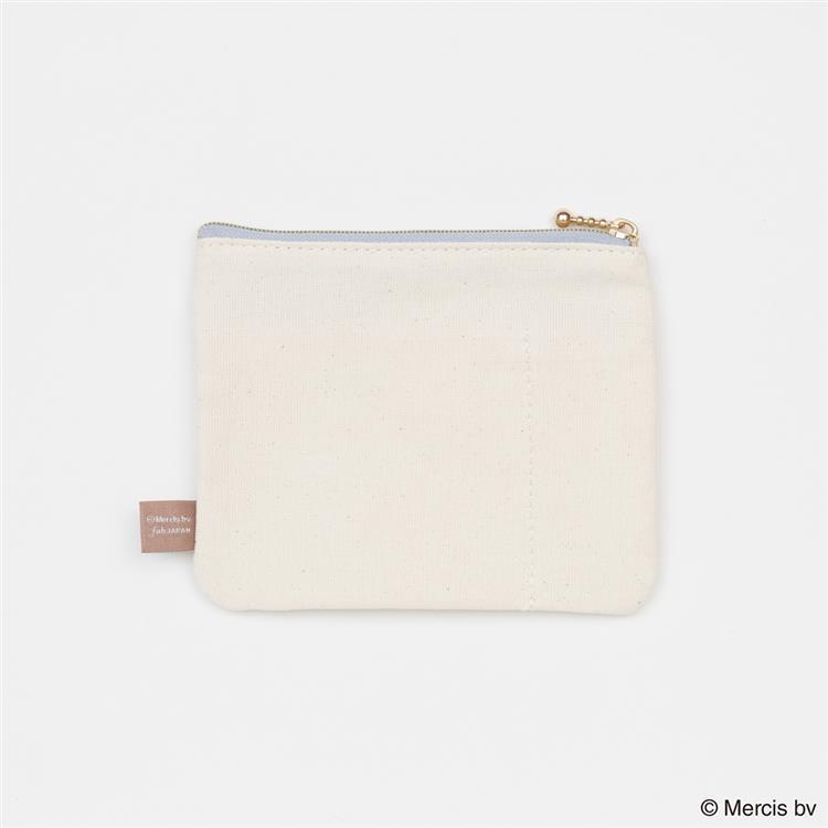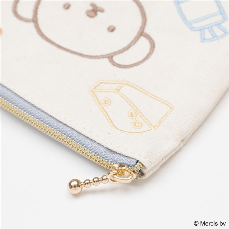 ボリスとフルーツなどのモチーフをカラフルなライン刺繍で表現したフラットポーチです。