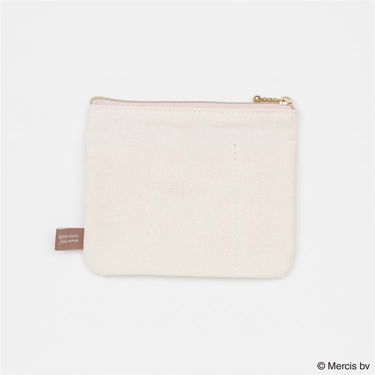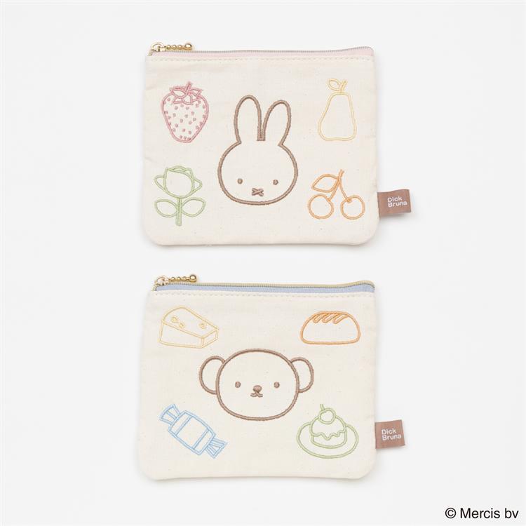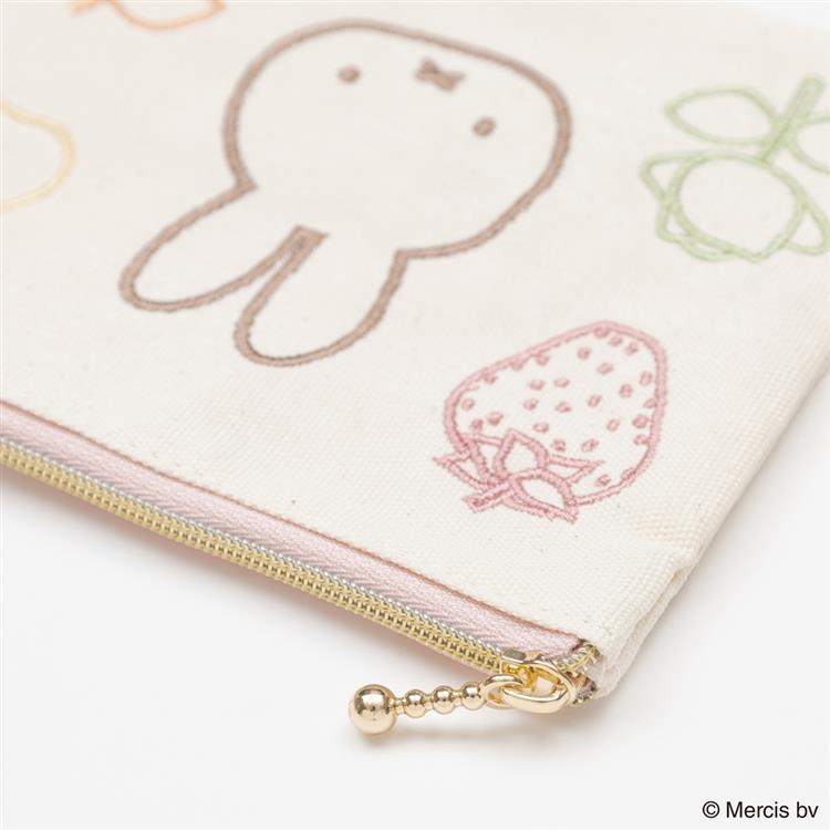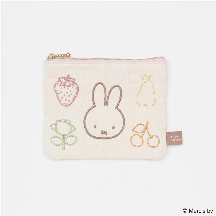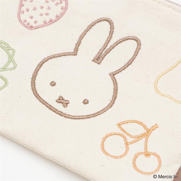ミッフィーとフルーツなどのモチーフをカラフルなライン刺繍で表現したフラットポーチです。