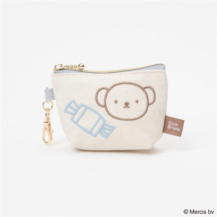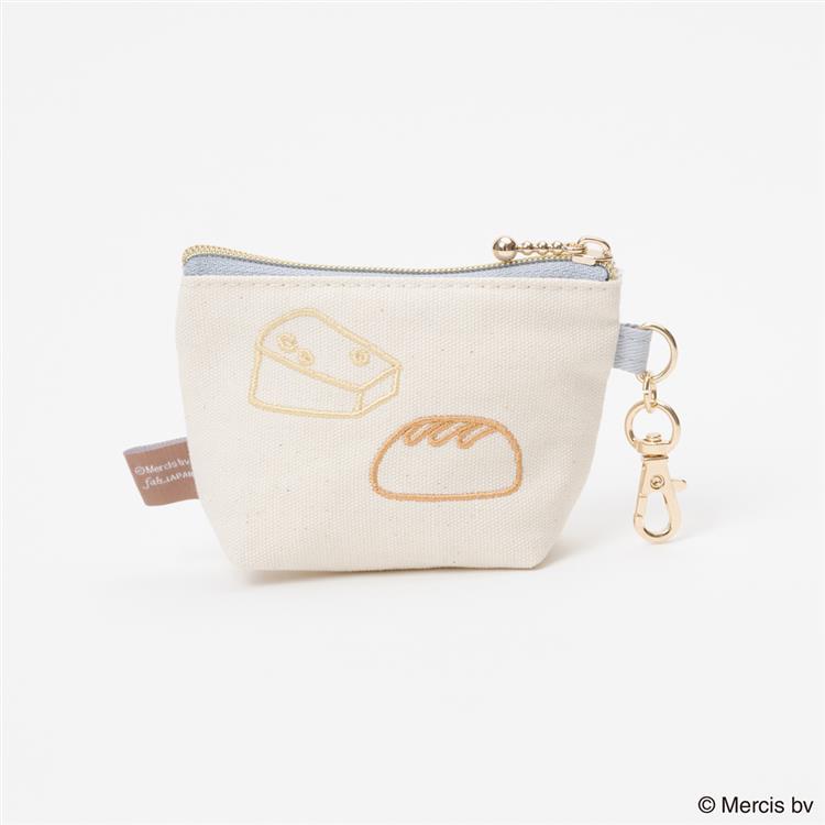 ボリスとフルーツなどのモチーフをカラフルなライン刺繍で表現した台形ポーチです。