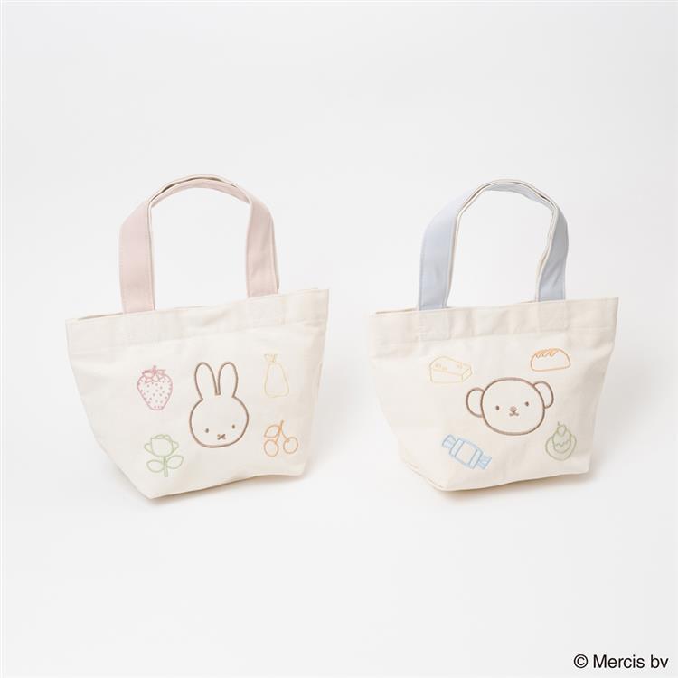 ボリスとフルーツなどのモチーフをカラフルなライン刺繍で表現したトートバッグです。