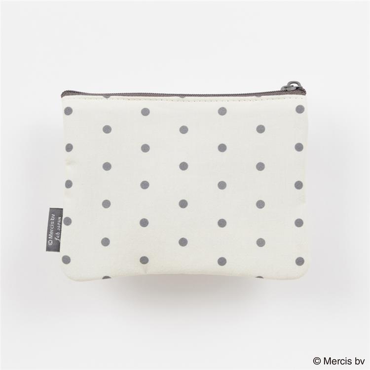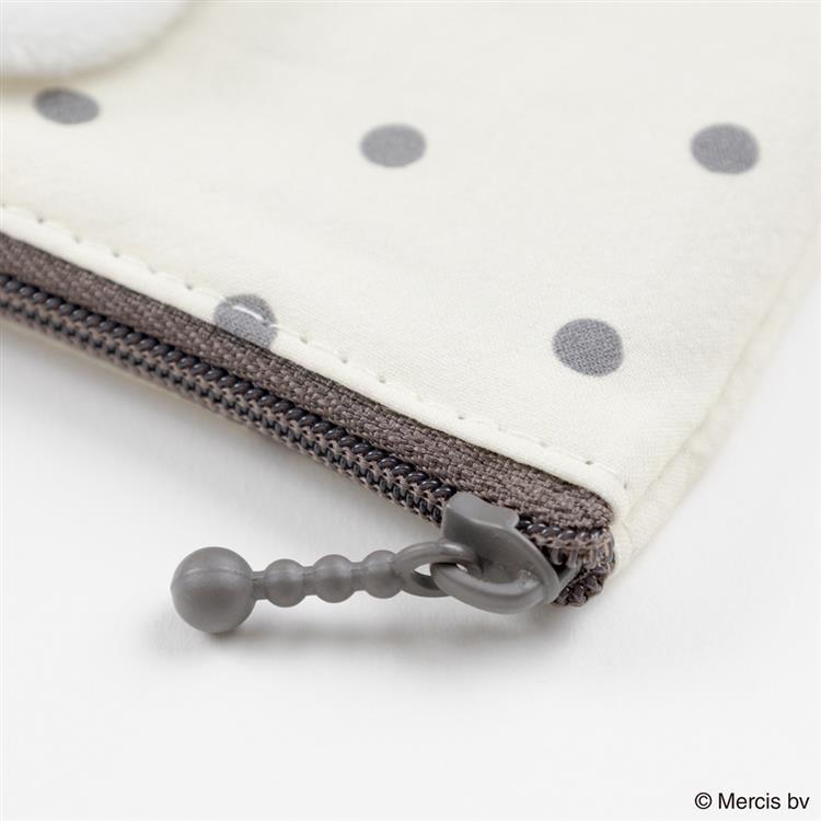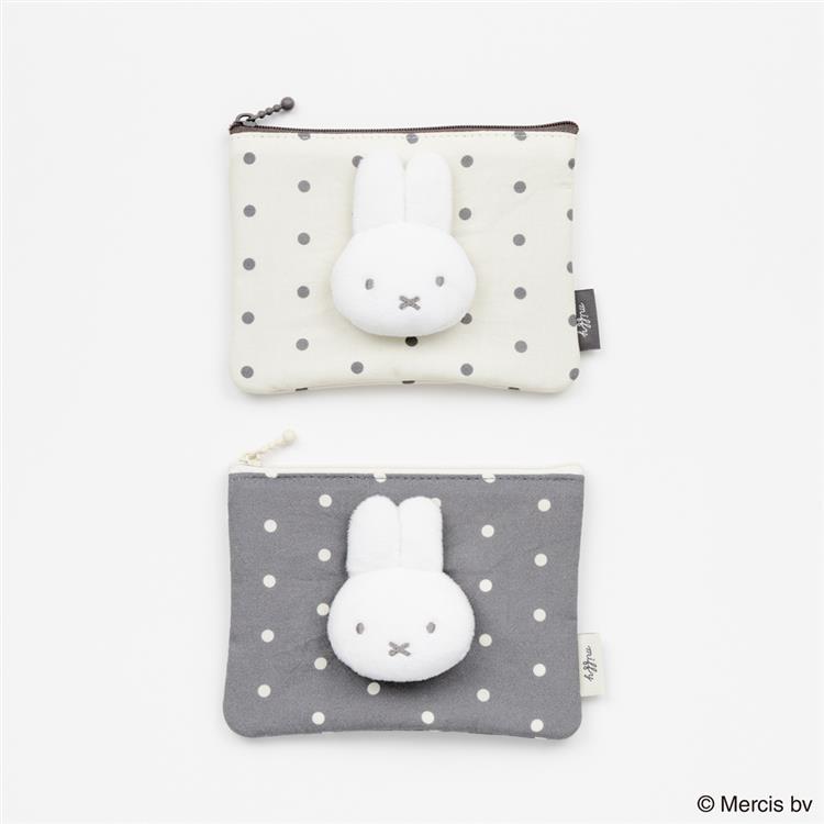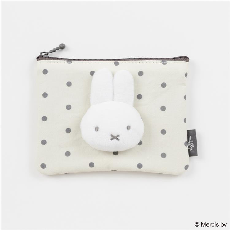 モノトーンのドット柄にミッフィーのマスコットが付いたミニフラットポーチです。