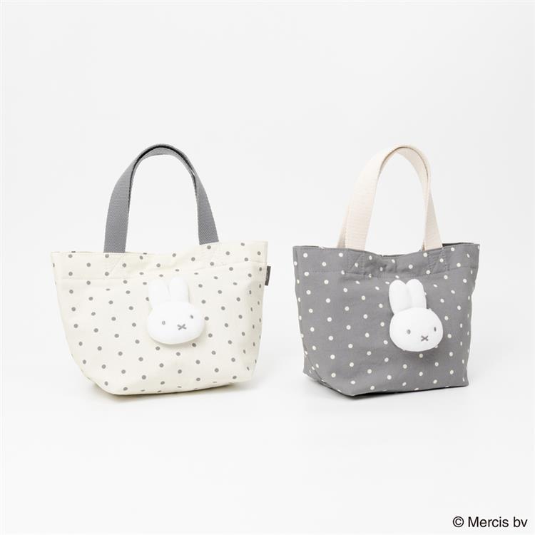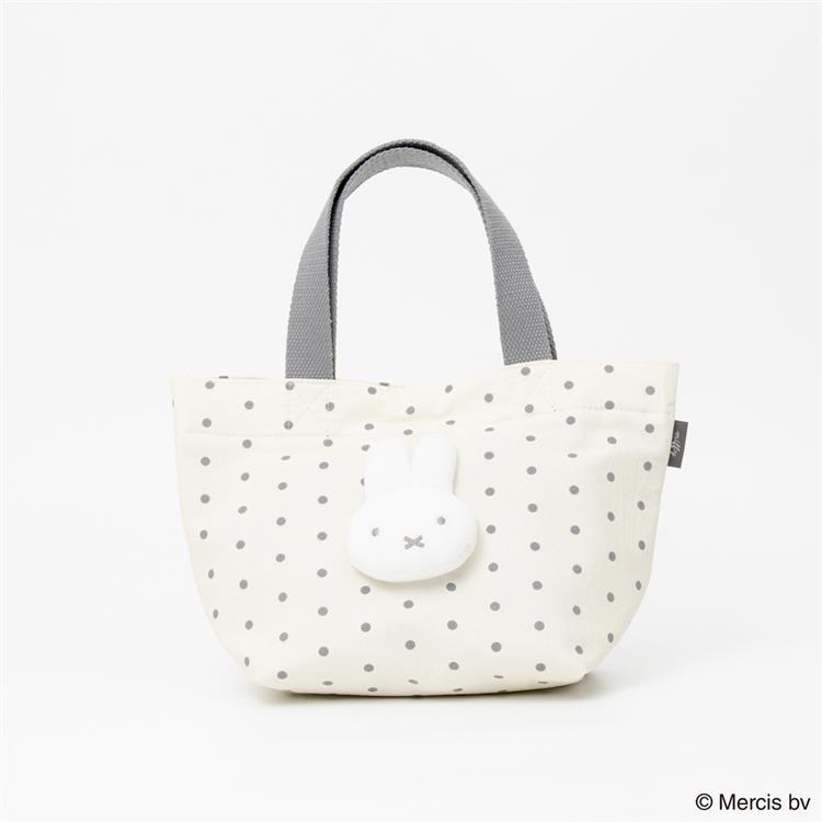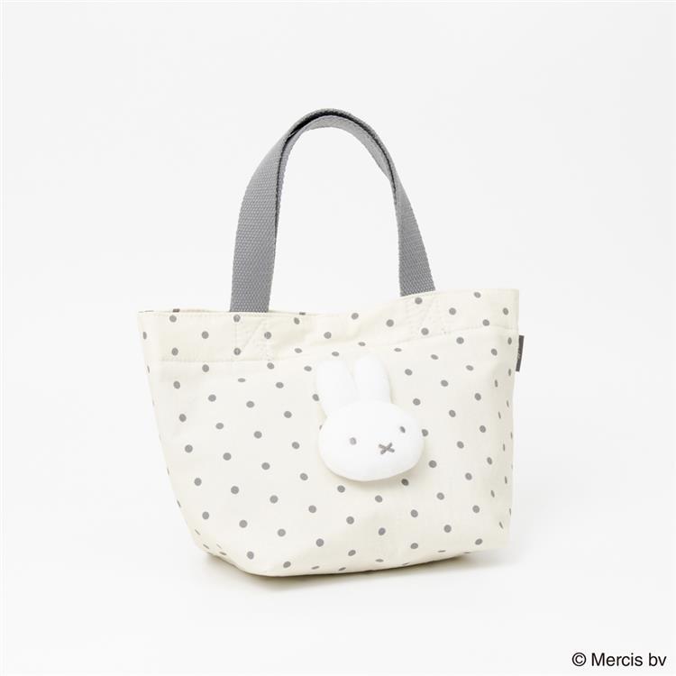 モノトーンのドット柄にミッフィーのマスコットが付いたトートバッグです。