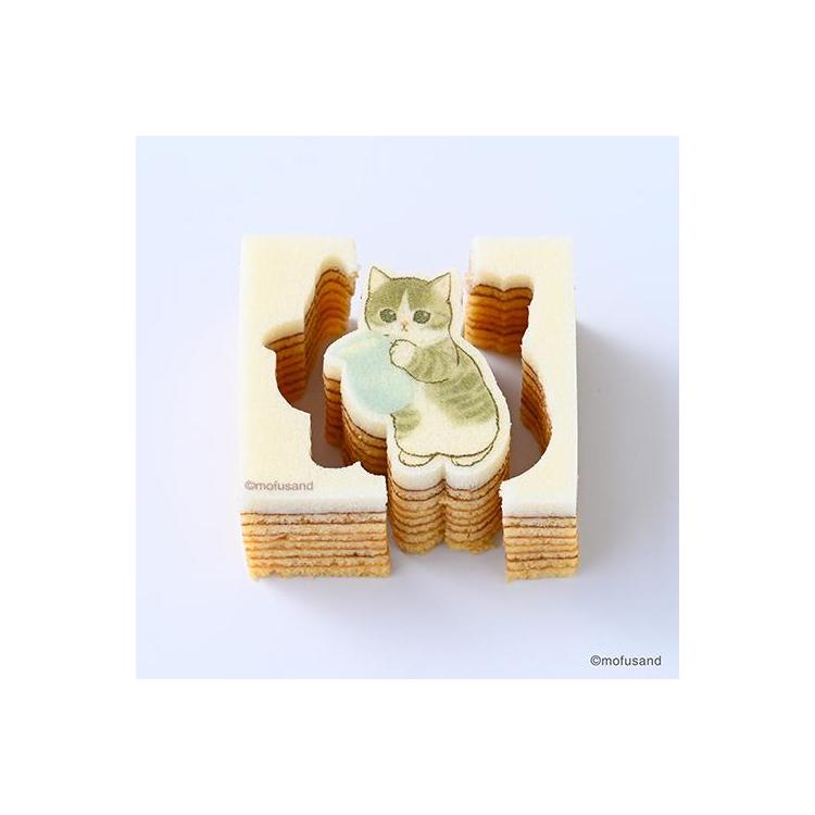 しっとりとした口あたりに、やさしいミルクの風味。一番上に重ねたメレンゲ仕立ての生地に、かわいいにゃんこの絵柄をプリントしました。