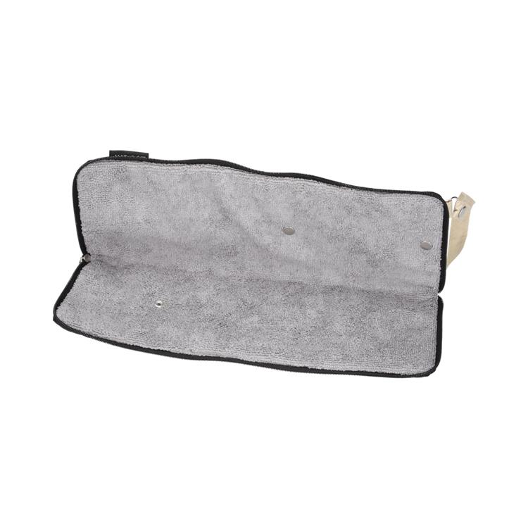 内側は吸水性の高いマイクロファイバー素材を使用しており、ファスナーが全開できるので広げればタオル状にもなり水滴を拭き取ることもできます。