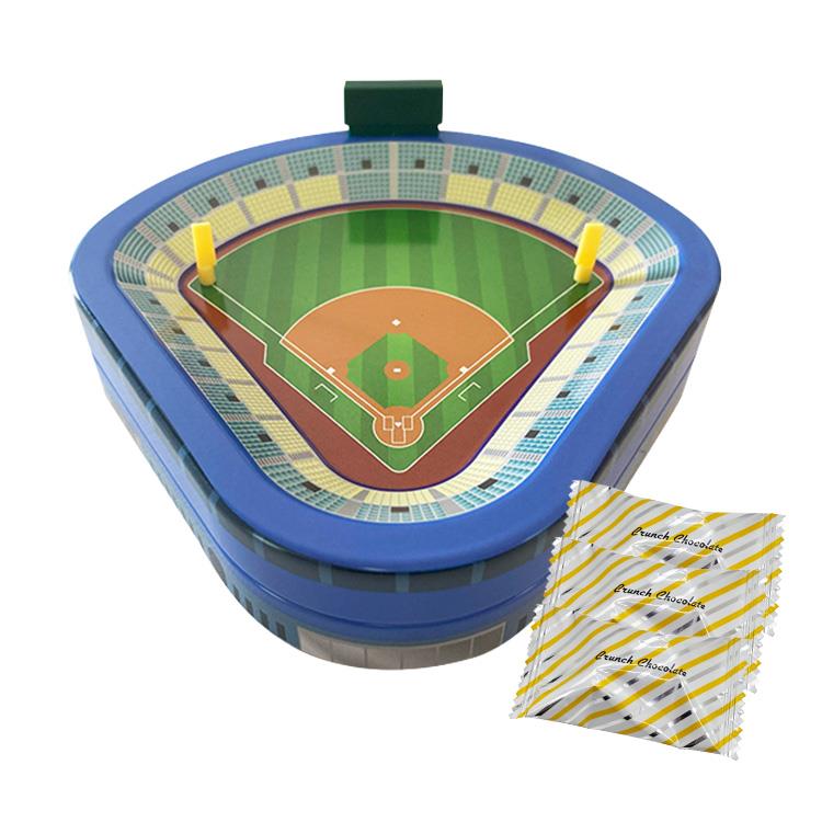 立体的な野球場デザインの缶にクランチチョコが入っています。