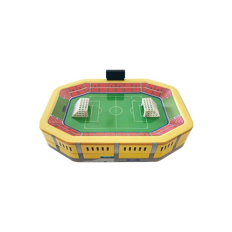 立体的なサッカースタジアムがデザインされた缶にクランチチョコが入っています。