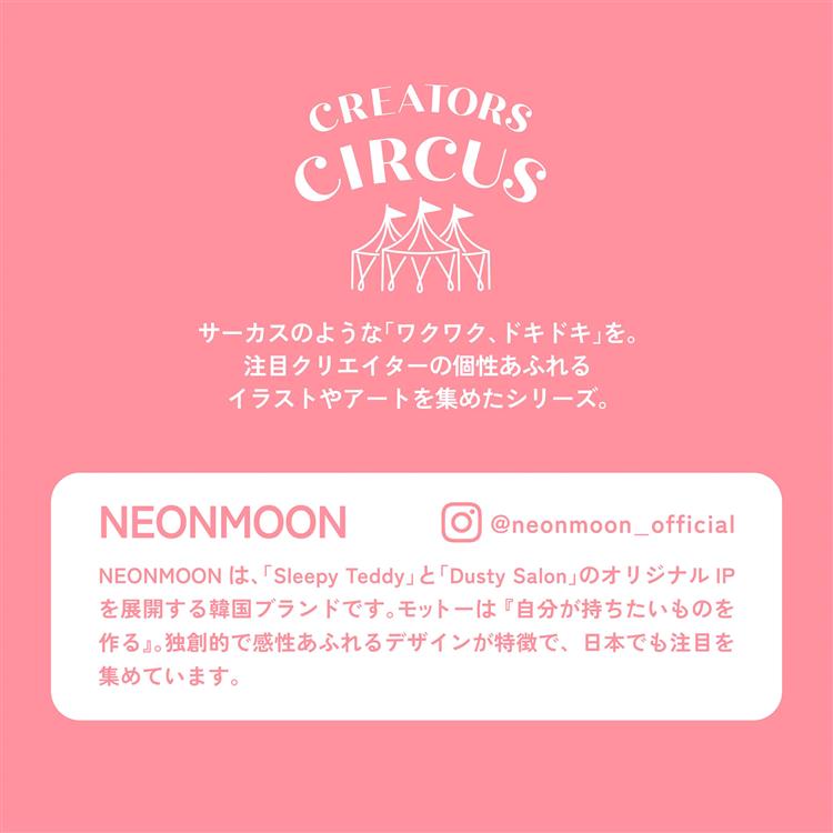 - NEONMOON:NEONMOONは、「Sleepy Teddy」と「Dusty Salon」のオリジナルIPを展開する韓国ブランドです。モットーは 『自分が持ちたいものを作る』。独創的で感性あふれるデザインが特徴で、日本でも注目を集めています。