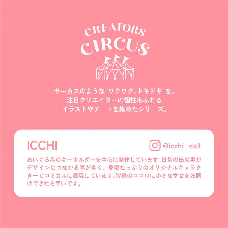 - ICCHI:ぬいぐるみのキーホルダーを中心に制作しています。日常の出来事がデザインにつながる事が多く、愛嬌たっぷりのオリジナルキャラクターでコミカルに表現しています。皆様のココロに小さな幸せをお届けできたら幸いです。