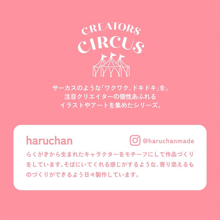- haruchan:らくがきから生まれたキャラクターをモチーフにして作品づくりをしています。そばにいてくれる感じがするような、寄り添えるものづくりができるよう日々製作しています。