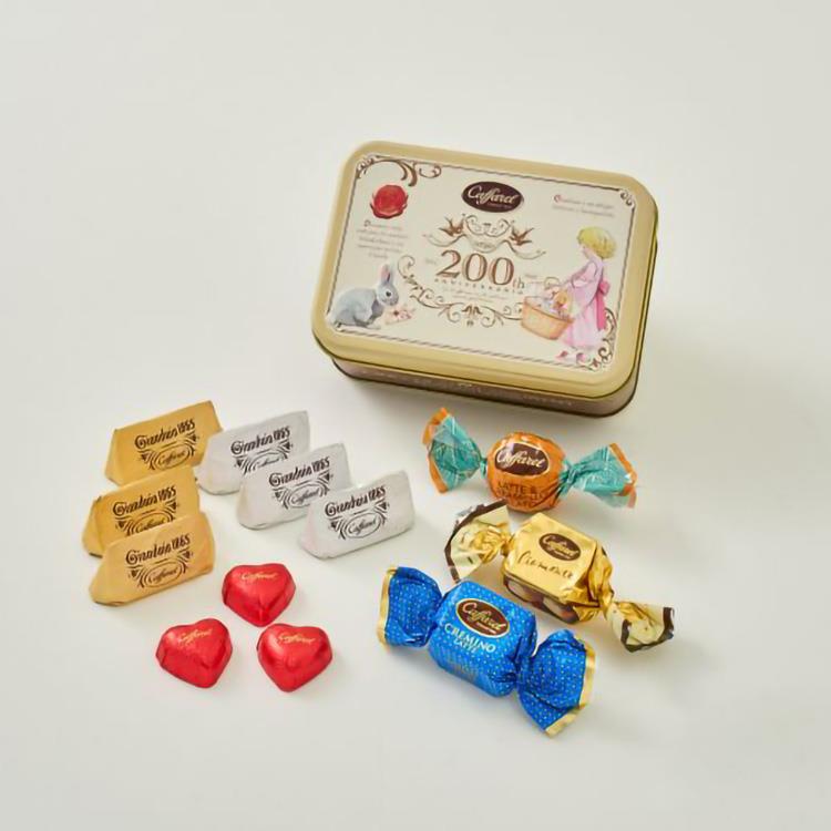カファレルイラストの猫達が手紙を準備しているシーンが華やかなデザインの缶に定番の「ジャンドゥーヤ」などをアソートしました。