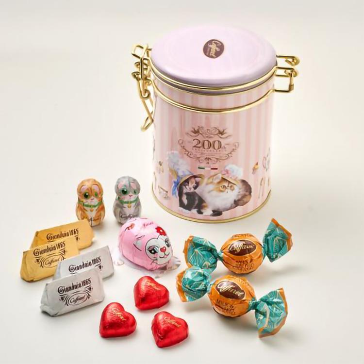カファレル創業200周年のロゴが入ったロマンティックなピンクとパープルのコンビネーションが可愛いキャニスター缶に、「ジャンドゥーヤ」などの定番チョコレートをアソートしました。