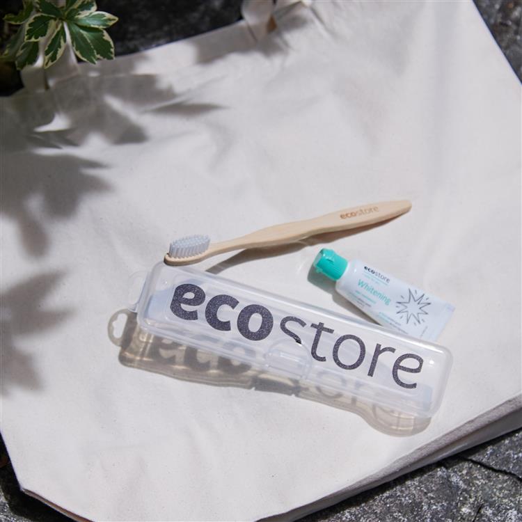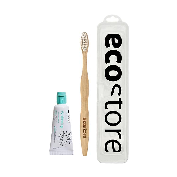 ホワイトニングトゥースペーストのミニサイズ、竹とひまし油由来の素材を使用した歯ブラシと、再生PPを使用したケースがセットになった商品です。