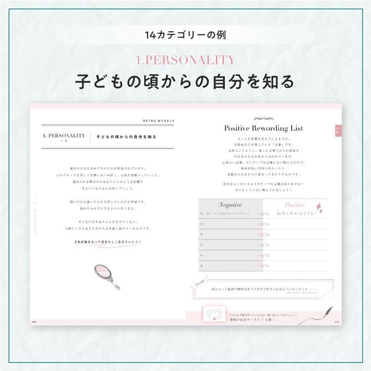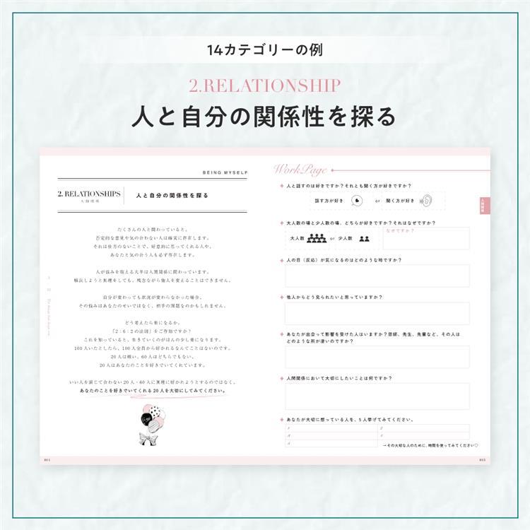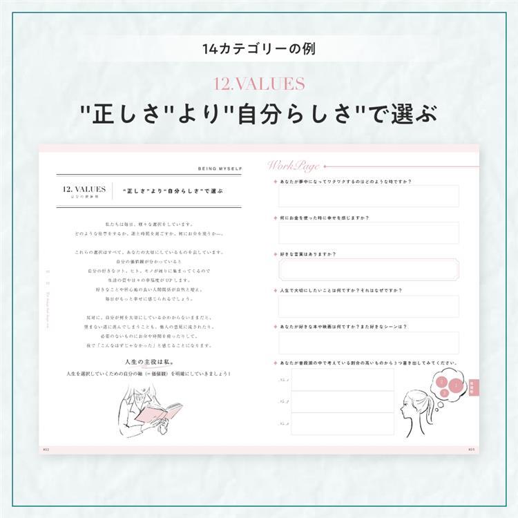 私らしさに気付く12カテゴリー(約200個)の質問ワークに答えていくことで、本当の自分を知ることができるワークブックです。