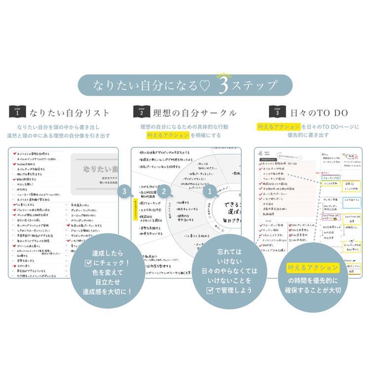 ・Step3《叶えるアクション》では、日々どうしてもやらなければいけないタスクだけでなく、なりたい自分になるための具体的な行動『夢を叶えるアクション』を日々のスケジュールに優先的に書き出します週間バーチカルページに『叶えるアクション』を書き出すことで、「いつ」やるかを決めることができます。