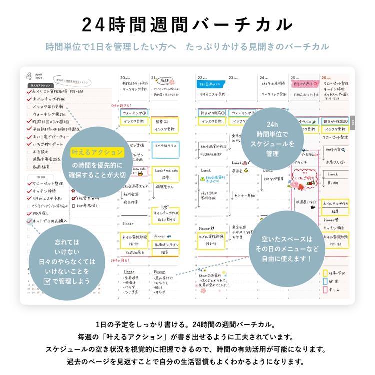 ・「週間バーチカル」は、1日の予定をしっかり書ける24時間。忙しい予定も「叶えるアクション」も細かく書き込めます。