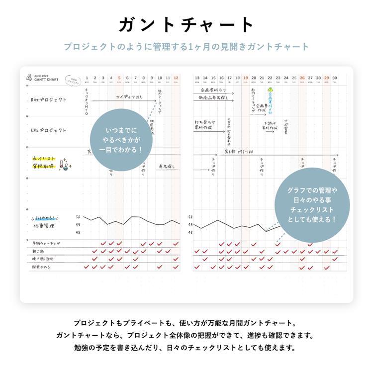 ・ガントチャートは、プロジェクトだけでなく、勉強の予定を書き込んだり、日々のチェックリストとしても使えます。もちろん、マンスリーページも充実。上下段で点線入り。午前・午後で分けたり、自分と家族のスケジュールで分けたり自由に使い分けできます。