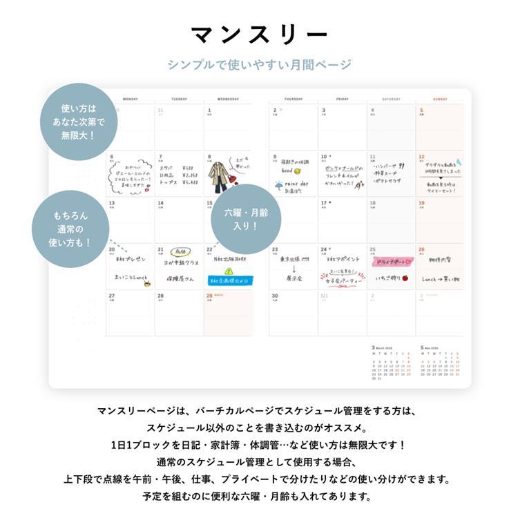 【構成】年間スケジュール/マンスリー(六曜あり・月齢あり)/なりたい自分リスト/理想の自分サークル /叶えるアクション欄付き24h週間バーチカル/月間ガントチャート/やらない事リスト/自分年表/メモ/ペンホルダー
