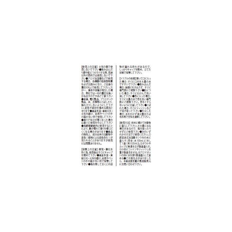 ・アロマ加湿器などで使用する場合、各機器の取扱説明書を必ずお読みになり、ご自身の責任のもとで使用してください。万が一、事故や故障が発生した場合、弊社では一切の責任を負いかねますので予めご了承ください。