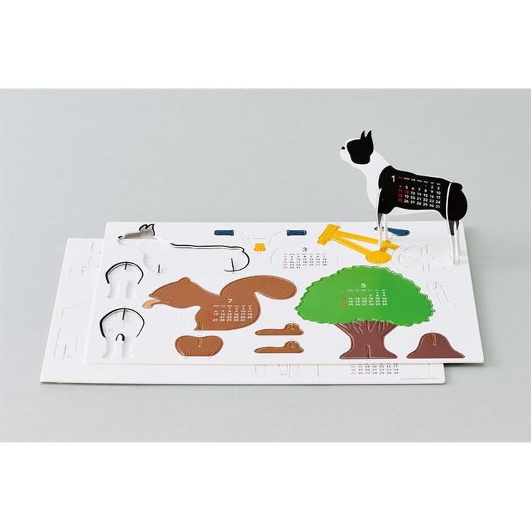 自転車、ブランコ、動物などキットが6種類セットされており、パーツの記号を合わせて組み立てると、2カ月表記のカレンダーになります。