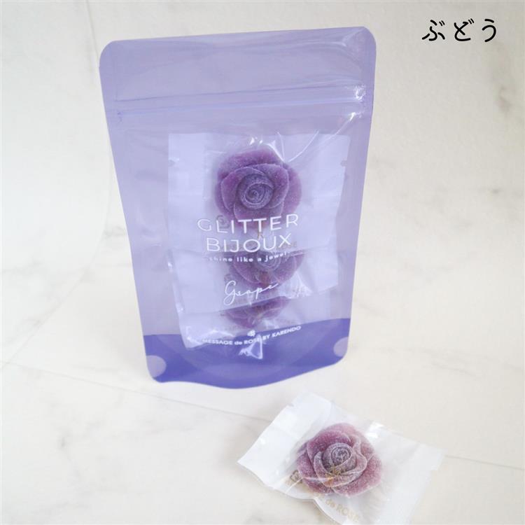 透明感あふれるパウチに、フルーツ果汁を贅沢に使用した宝石(ビジュ)のように輝くバラの形のグミが入っています。