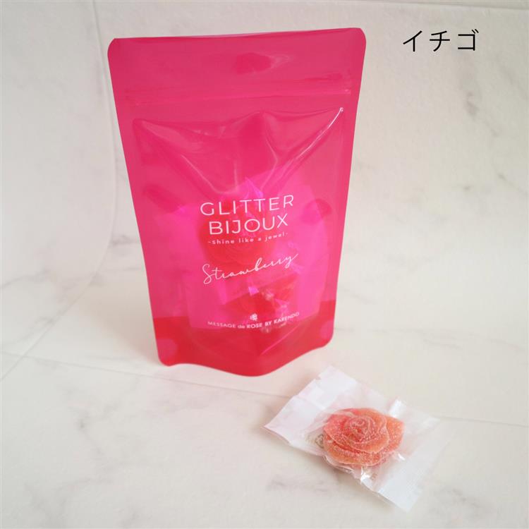 透明感あふれるパウチに、フルーツ果汁を贅沢に使用した宝石(ビジュ)のように輝くバラの形のグミが入っています。