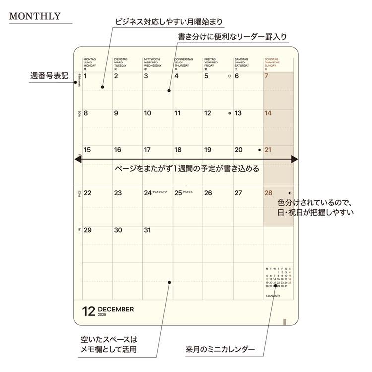 「Pre.12」は、1月始まり/4月始まりのどちらにも使える16ヶ月対応の画期的なハイブリッド・ダイアリー。2025年12月~2027年3月