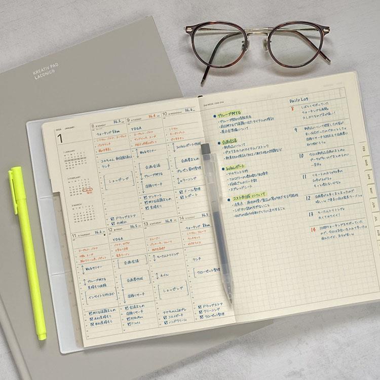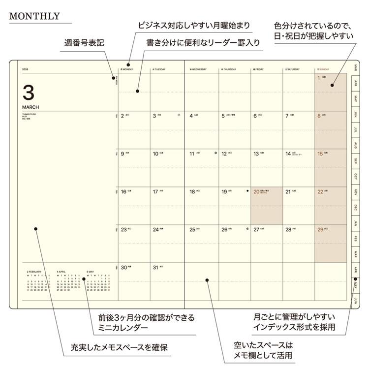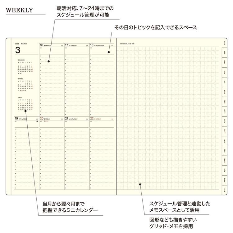 別途ご用意したカバーと合わせて使用したり、ノート感覚でそのまま使うなど、従来のリフィル以上の所有感が得られます。片面1週間のスケジュール管理+メモページを組み合わせた月ごとの管理に最適なインデックス付きの週間ダイアリー。