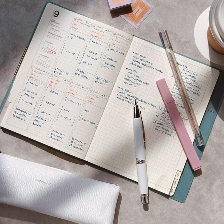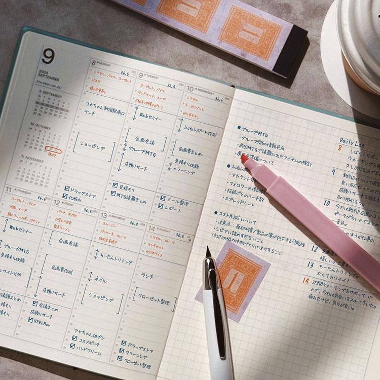 別途ご用意したカバーと合わせて使用したり、ノート感覚でそのまま使うなど、従来のリフィル以上の所有感が得られます。片面1週間のスケジュール管理+メモページを組み合わせた月ごとの管理に最適なインデックス付きの週間ダイアリー。