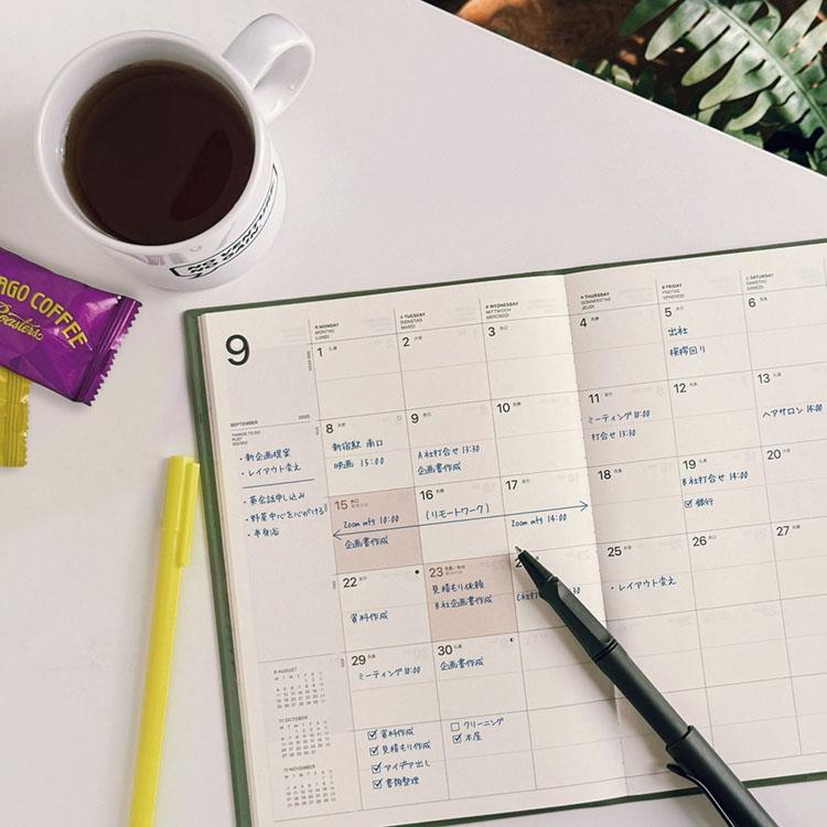 大判ならではの視認性の高さと書き込みやすさが特長の、見開き1ヶ月/6段表記の月間ダイアリー。