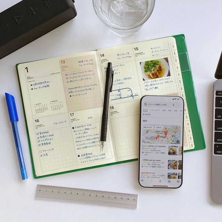 記入自由度の高いグリッド罫のメモスペースのため、スケジュール管理のほか、日記やライフログなどにも適しています。