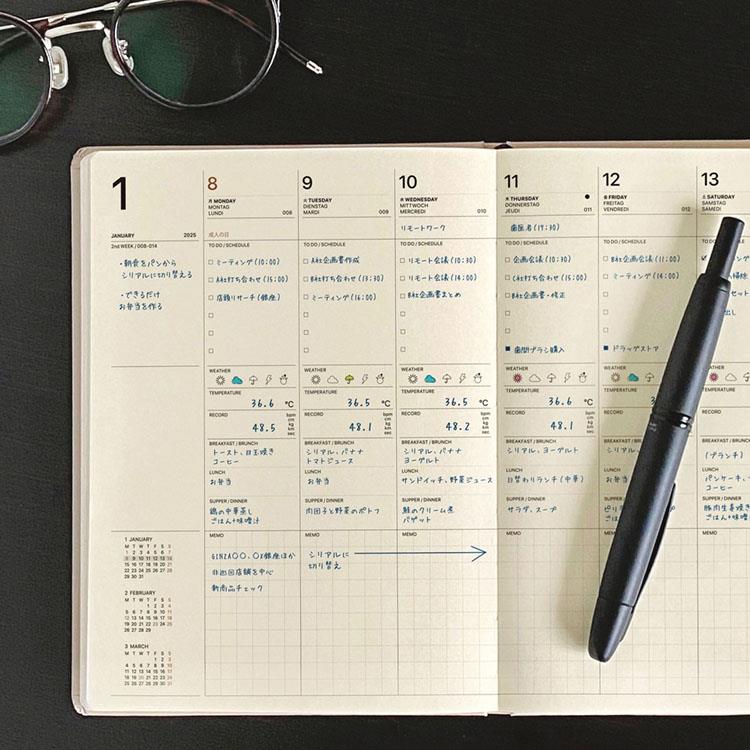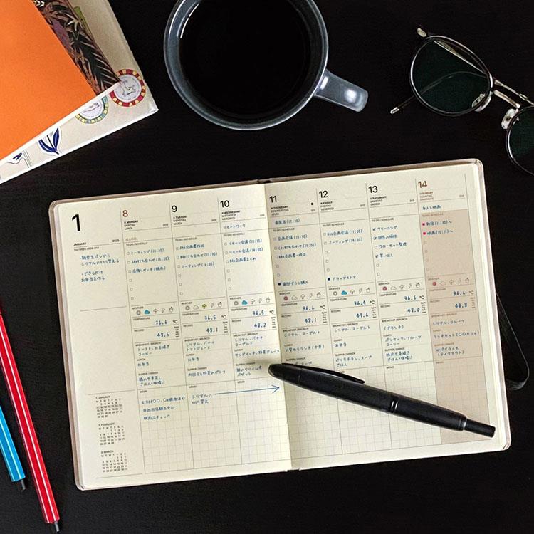 別途ご用意したカバーと合わせて使用したり、ノート感覚でそのまま使うなど、従来のリフィル以上の所有感が得られます。日々の変化を直感的に把握できる、見開き1週間のライフログ・ダイアリー。
