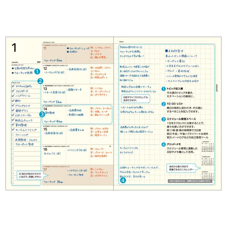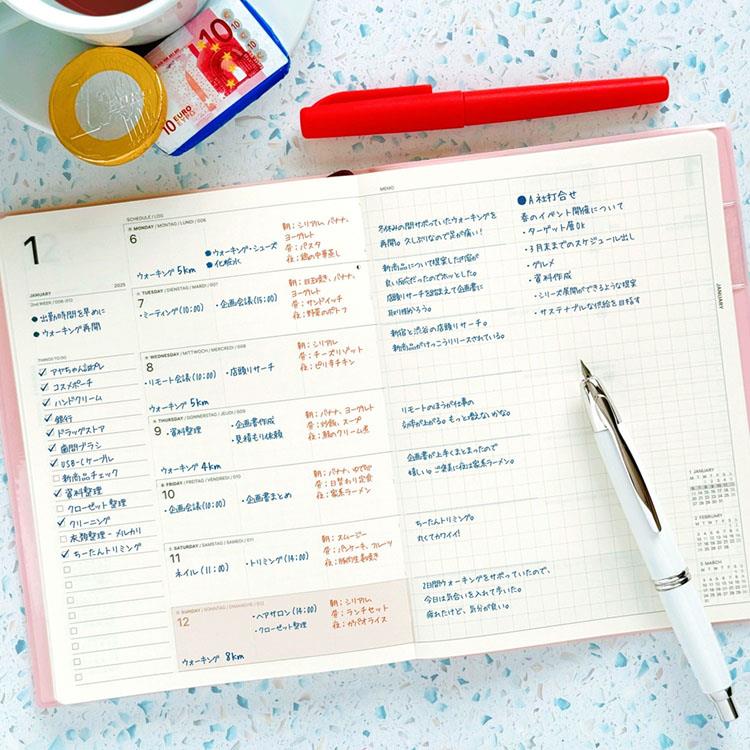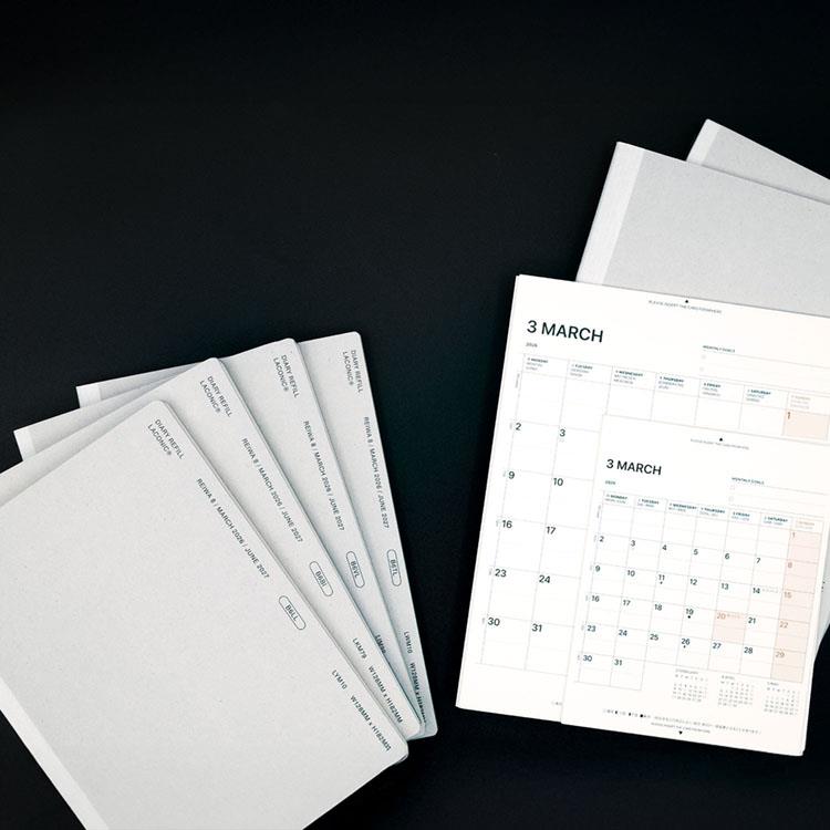 別途ご用意したカバーと合わせて使用したり、ノート感覚でそのまま使うなど、従来のリフィル以上の所有感が得られます。タスク型のスケジュール管理+メモページを組み合わせた毎日の自己管理やライフログにも最適な週間ダイアリー。