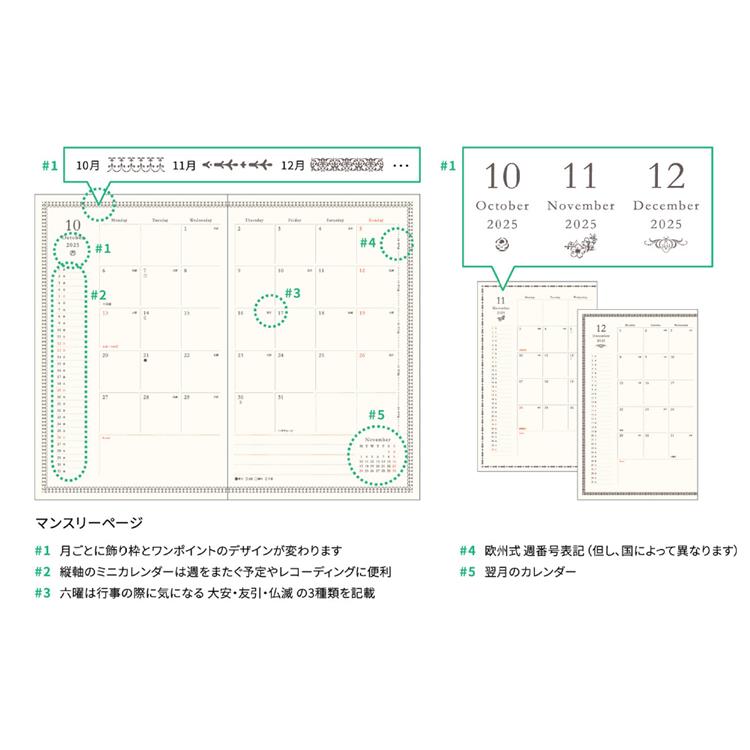 新書サイズのコンパクトなマンスリーダイアリー。毎月飾り枠とワンポイントのデザインが変わります。縦軸ミニカレンダー、翌月カレンダー、大安、友引、仏滅の表記あり。