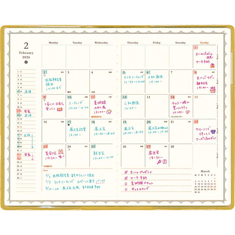 月ごとに飾り枠とワンポイントモチーフが変わる月間ダイアリー