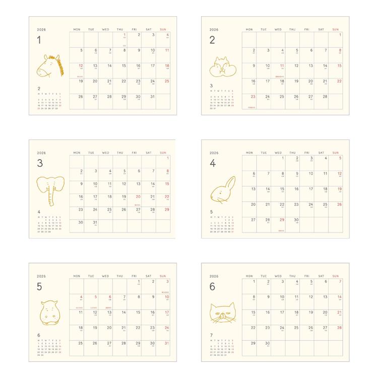 クスッと笑える線画で描いたゆるい動物たち「ティックル」シリーズ2026年版カレンダー。