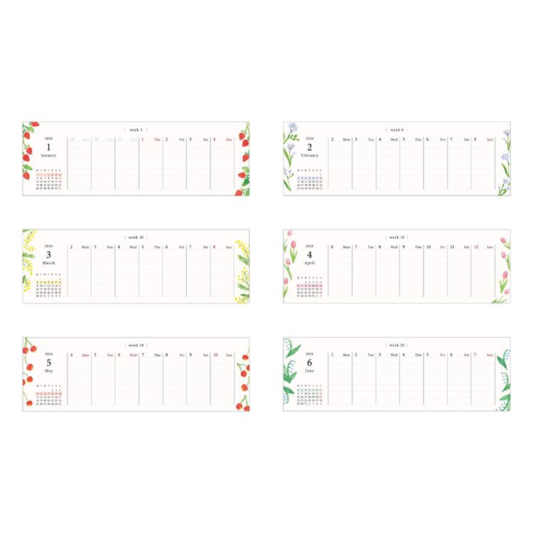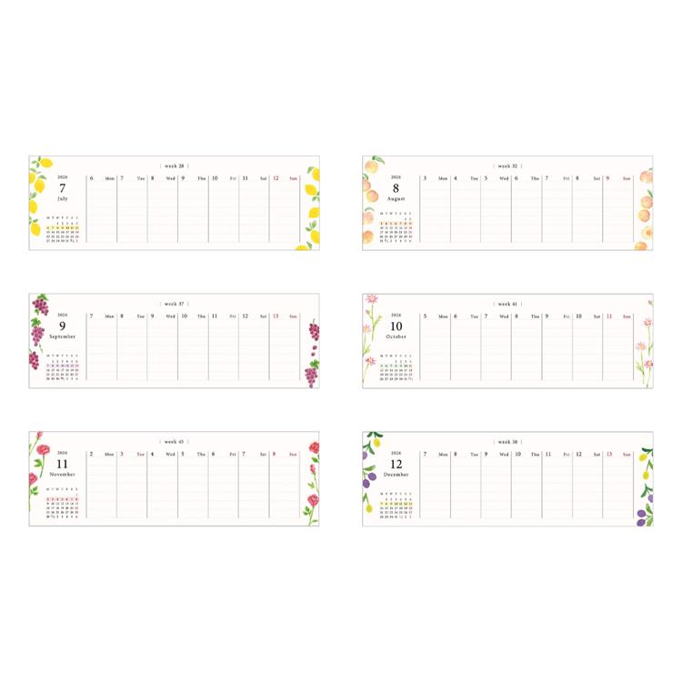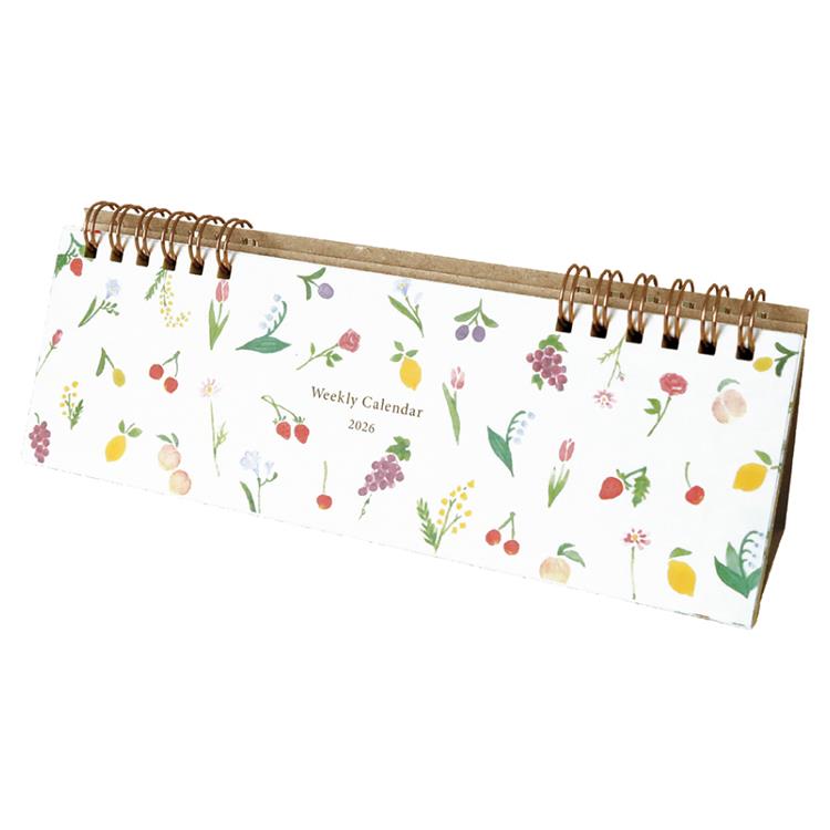 水彩で描かれた月ごとに変わる季節の花やフルーツが毎週を彩ります。