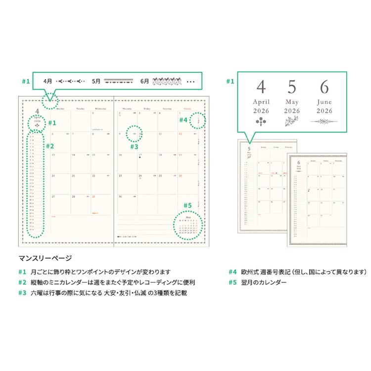 月ごとに飾り枠とワンポイントモチーフが変わる月間ダイアリー