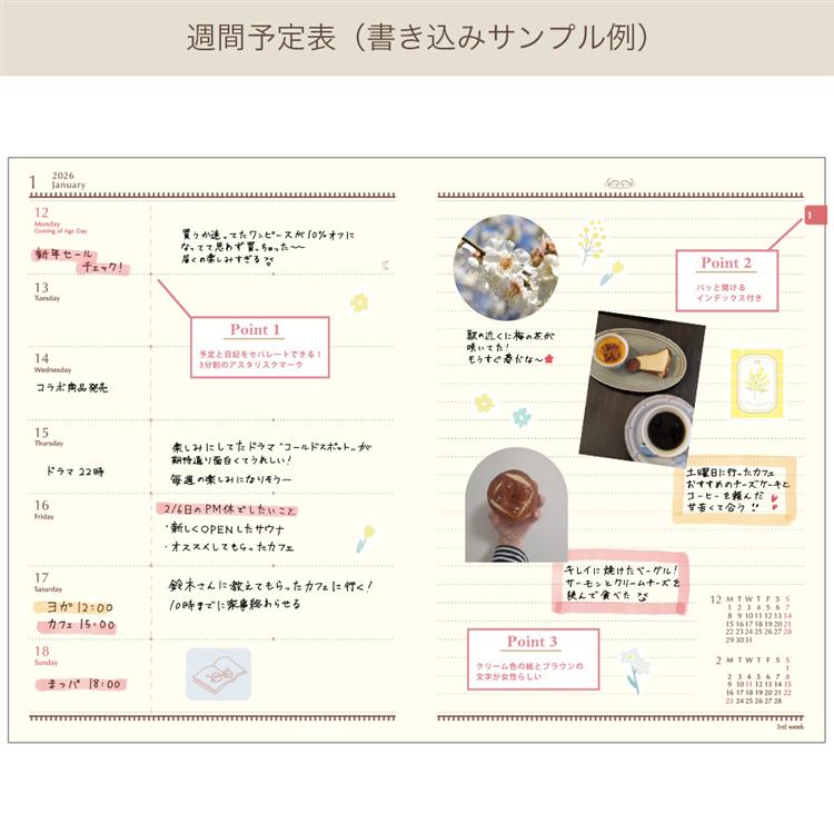 - (品番)2601CKI-PK、(始まり月)2026年1月~2026年12月、(始まり曜日)月曜始まり、(レイアウト)週間ウィークリー、(サイズ)B6サイズ、(内容)2026・2027年間カレンダー/ノート/ルックバック/ネクストイヤープラン/日本地図/世界地図/パーソナルデータ/インデックス、(本文)192ページ